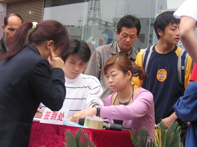 排隊簽到,不過這位小姐昨晚可能睡得不太好哦