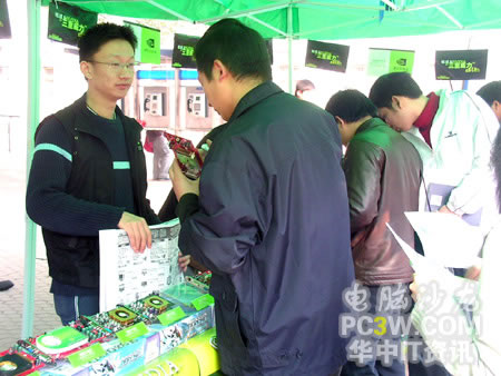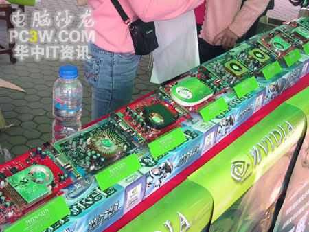 基于SM3.0、HDR以及SLI這三大顯示技術(shù)的GF6系顯卡產(chǎn)品擺滿了整個產(chǎn)品展示區(qū)的展臺。從入門級的6200TC直到最近被各大IT媒體所熱炒的6800GS,展示產(chǎn)品可以說是琳瑯滿目。