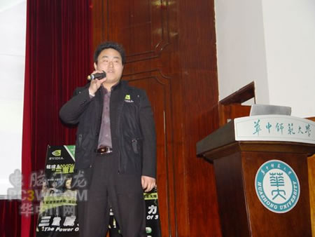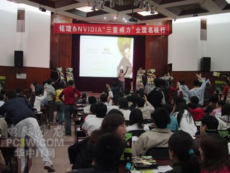講座首先由商科集團(tuán)武漢分公司天行電腦的甘松先生發(fā)言,他首先詳細(xì)的向大家解釋了銘瑄NVIDIA“三重威力”的定義。并就“三重威力”的具體內(nèi)容SM3.0、HDR以及SLI逐一做了詳細(xì)的說明。他生動幽默的演講引來同學(xué)們的陣陣掌聲,會場氣氛相當(dāng)融洽。