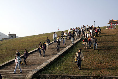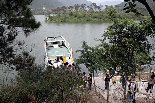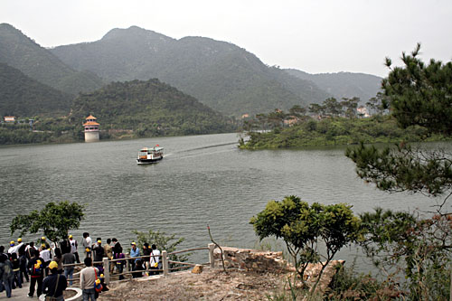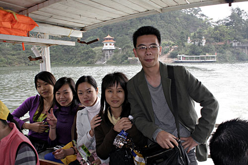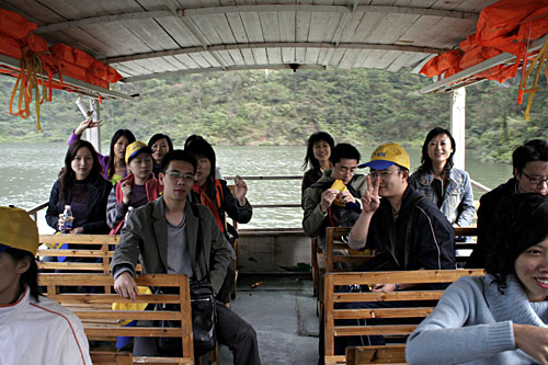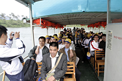首先進(jìn)行的項(xiàng)目是游覽九龍湖,大家依次登上游船后,開(kāi)始了輕松的路程。能搭載98人的大型游船滿(mǎn)載著商科全體員工向湖區(qū)深處行駛而去,大家一邊飽覽湖區(qū)美景,一邊悠閑的聊天或分發(fā)零食。游船引擎激起層層浪花向湖邊散去,湖岸上森林茂盛,郁郁蔥蔥,富含氧氣的清新空氣讓大家心情都很舒暢,雖然12月歷法上已經(jīng)進(jìn)入冬季,不過(guò)在廣州依然是初秋的氣息,湖上也刮起略帶涼意的秋風(fēng),但大家的興致依舊高昂。