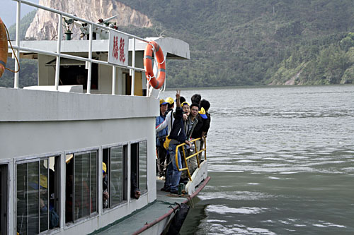 心急的同事已經(jīng)登上了游船頂層,不過(guò)這艘游船太小。湖區(qū)專(zhuān)門(mén)調(diào)來(lái)可以乘座近百人的大型游船