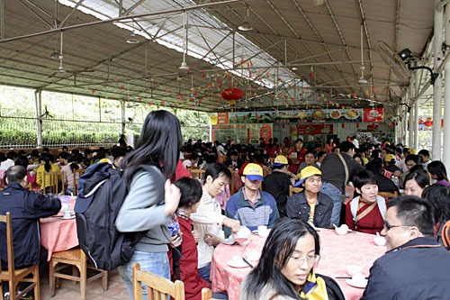在乘船游覽了美麗的九龍湖后,游船停靠在湖深處的岸邊,這里是通過(guò)鼎湖山溯溪探險(xiǎn)的起點(diǎn),由于大家已經(jīng)乘車(chē)乘船不少時(shí)間了,也都饑腸轆轆了。不過(guò)不用擔(dān)心,導(dǎo)游已經(jīng)安排好了,同事們一起來(lái)到湖邊的露天餐廳用餐,這里雖沒(méi)法和酒店賓館相提并論,但濃郁的鄉(xiāng)野氣息也別有一番情趣。