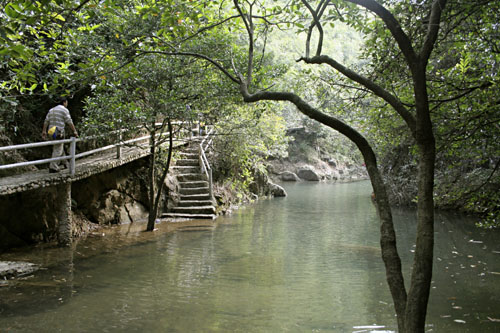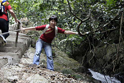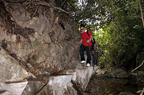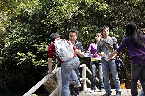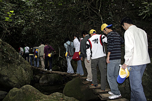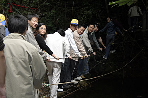 說(shuō)起探險(xiǎn)大家并不陌生,但沿著小溪逆流而上仍別有一番風(fēng)情,這里的小溪清澈見(jiàn)底,氣石林立,引起大家一致的贊嘆。溪水邊還生長(zhǎng)著茂密的竹林和樹(shù)木,同事們沿著小徑拾級(jí)而上,去尋找溪水的源頭,中間當(dāng)然也有很多驚險(xiǎn)的獨(dú)木橋和鋼絲索道,大家互相幫助,談笑風(fēng)生,路途有驚無(wú)險(xiǎn)。