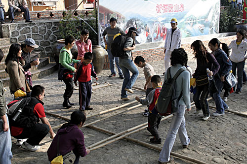 欣賞完客家MM的精彩表演后,同事們開(kāi)始用舞臺(tái)的道具玩起了竹排舞。