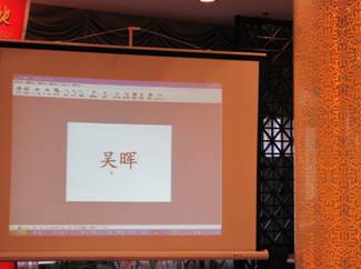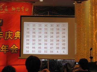 在屏幕中出現(xiàn)的1-54中,每個(gè)數(shù)字后面都代表中晚會(huì)在場的同事,看看誰會(huì)被選中呢?被選中的同事要參加我們準(zhǔn)備的游戲《快樂傳真》。