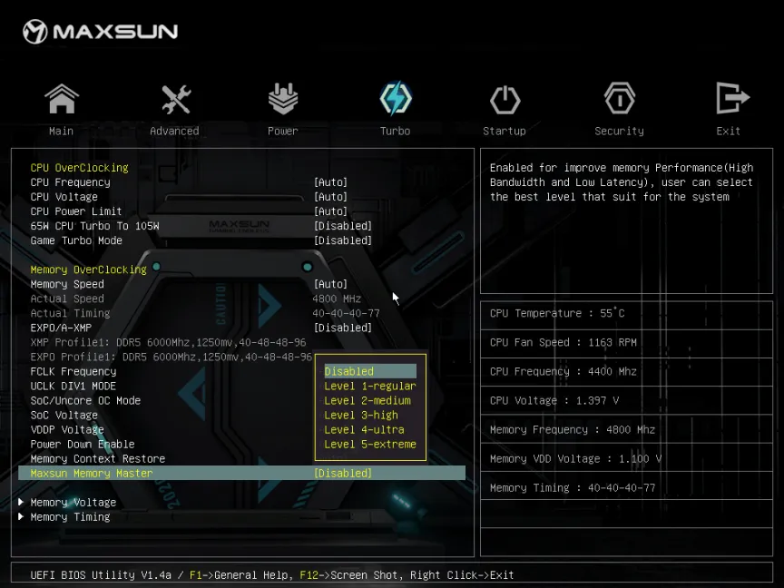 對于許多用戶而言,內存超頻可能仍然是一個復雜的話題。銘瑄全新推出MMM模式,幫助用戶快速實現輕松超頻。針對不同的用戶需求,MMM模式提供Level 1-5共5個檔位,預設內存優化配置,用戶直接選擇則可套用。5個檔位里,檔位越高,性能提升越明顯,但需注意的是同時對硬件體質要求也更高,用戶可根據自身實際情況操作,選擇最適合自身需求的內存配置。