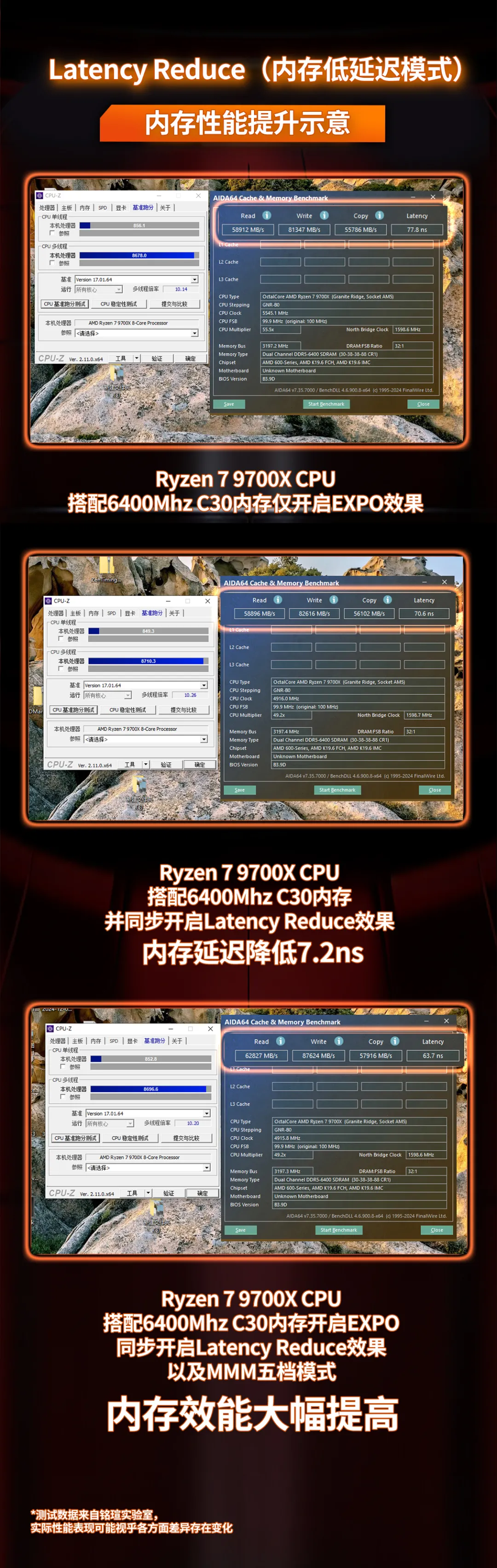 據銘瑄實驗室實測,開啟MMM模式Level5后對比未開啟MMM模式,讀寫性能提升9.1%,延遲減少14.8%,性能提升表現卓越(注:實際性能表現因硬件配置、軟件環境等多方面差異而存在變化,因架構差異原因,銳龍8000系列不支持該功能)。