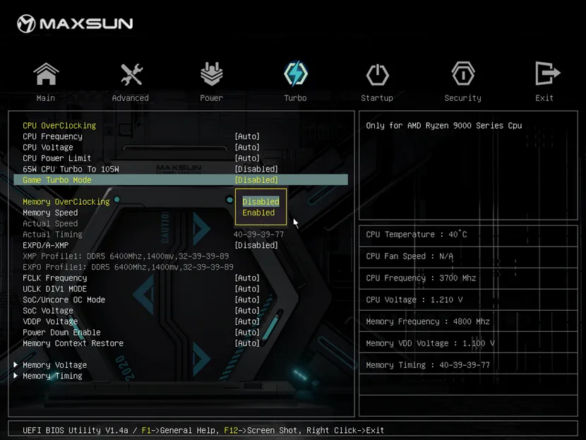 在BIOS頁面中選擇“Game Turbo Mode”,點擊“Enabled”選項來開啟此功能,按F10儲存設定重新啟動即可享受更流暢、視覺效果更佳的游戲體驗。
