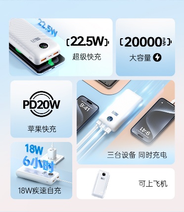 值得一提的是,魔閃20充電寶針對(duì)不同設(shè)備進(jìn)行了深度優(yōu)化。支持華為手機(jī)22.5W超級(jí)快充,半小時(shí)充60%的電量讓華為用戶能夠快速為設(shè)備恢復(fù)電量,大大節(jié)省了充電時(shí)間。對(duì)于蘋果15-16系列手機(jī)用戶來說,魔閃20同樣表現(xiàn)出色,支持PD20W快充,半小時(shí)續(xù)航50%,能夠?yàn)樘O果設(shè)備提供高效、穩(wěn)定的充電體驗(yàn)。
