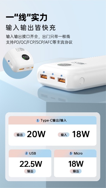 魔閃20充電寶以其卓越的性能和人性化的設(shè)計(jì),重新定義了移動(dòng)充電的體驗(yàn)。20000毫安的大容量,能夠輕松滿足您在日常出行、長途旅行甚至緊急情況下的充電需求。無論是智能手機(jī)、平板電腦還是其他電子設(shè)備,魔閃20都能提供可靠的電量支持。